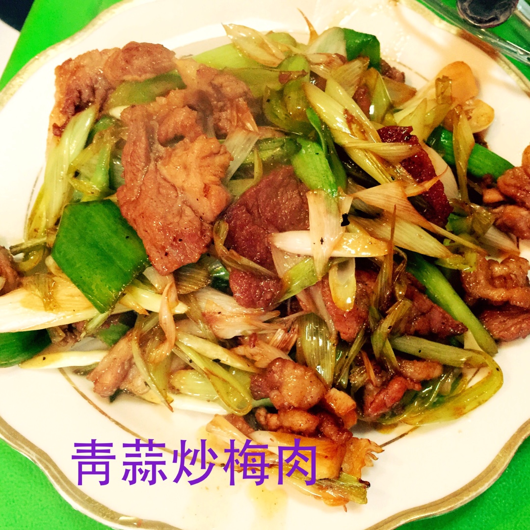 青蒜炒梅肉。青蒜生南国,炒肉太美味。