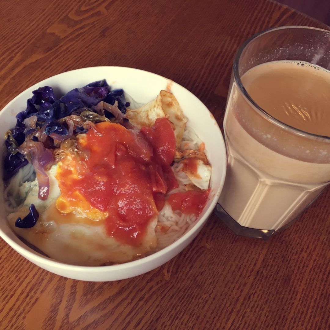 自熬番茄酱煎鸡蛋面,配时蔬,女儿小碗已开吃,焦糖奶茶归我,夏天来了~