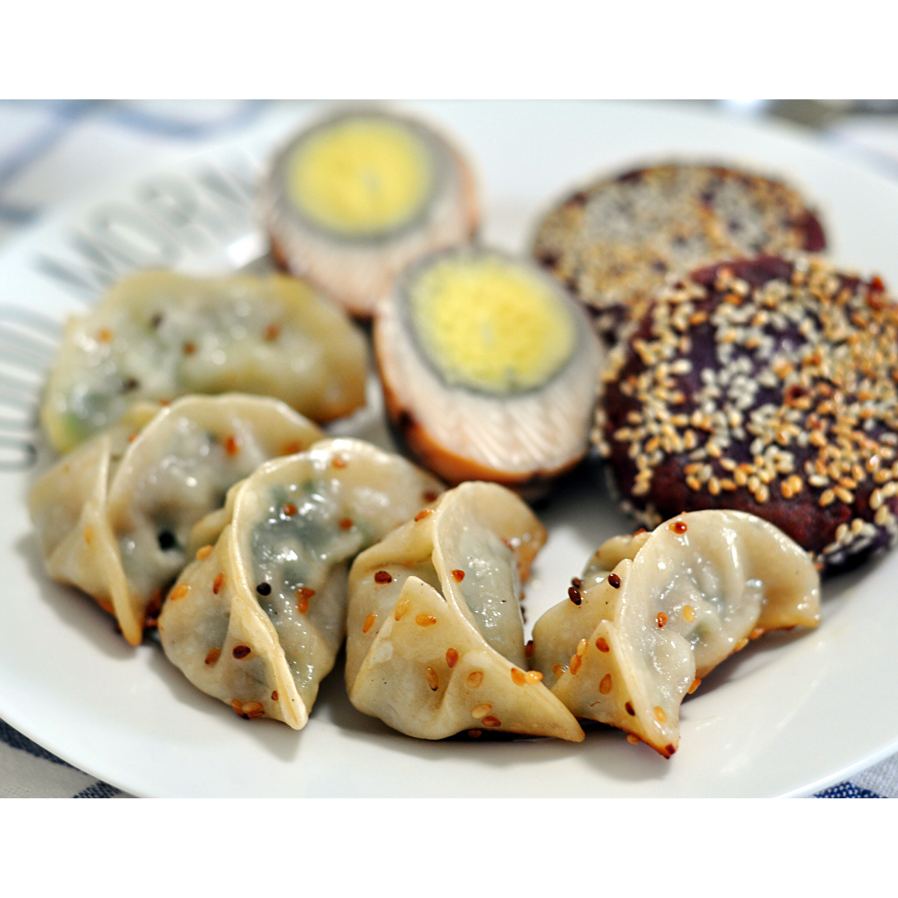 亲爱的简 做过 早餐•2016年5月7日 早上简同学一睁开眼睛就问:“妈妈,你自己做的紫薯饼还有吗?我现在又想吃紫薯饼、又想吃烤饺。”还好冰箱里还有一些存货,反正是周末,那就一起上呗!烤饺、紫薯豆沙南瓜饼、茶叶蛋、黄桃三明治、紫菜汤… #早餐•2016年5月7日# 2016-05-07