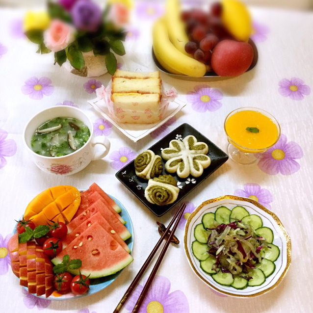 早安!新周愉快🌹早餐有香菇蔬菜粗粮粥,菠菜花卷,培根鸡蛋三明治,海蜇拌黄瓜,芒果汁,水果!