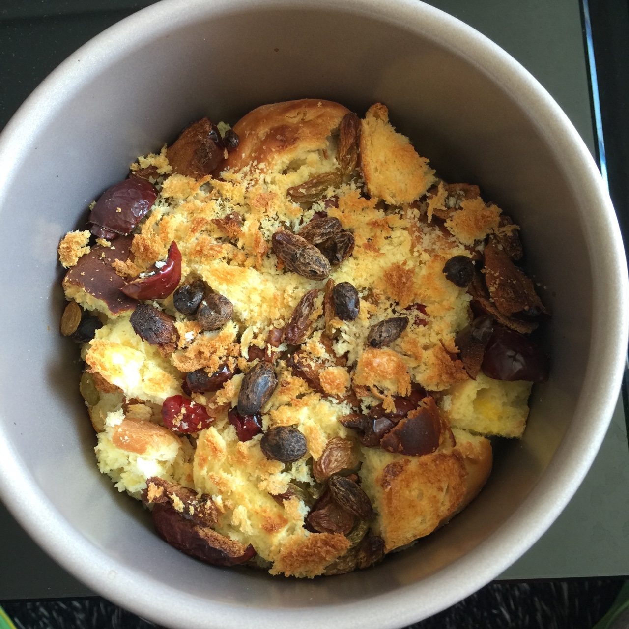 剩下没吃完的面包利用上了,看上去不大整齐,加了红枣蔓越莓和葡萄干,真的没想到烤面包会很香,下次还要再做!