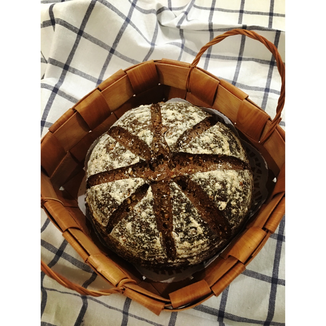 也不知道脑子在想什么,发酵了一次没排气就直接烤了,想不到效果也不错,虽然温度有点过,但是焦香的味道也很好吃