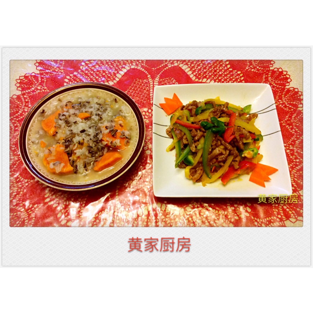彩椒炒肉丝,野米红薯粥