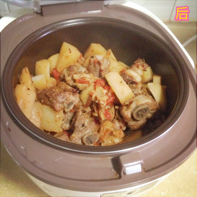 做法稍微有点不同。排骨洗了然后用料酒和盐腌制了几小时。开火下油先爆姜蒜花椒和干辣椒,然后捞起来扔掉,下排骨,下豆瓣酱和姜蒜,料酒,生抽老抽,放盐和白糖,一起翻炒。然后倒开水,适量多一点,毕竟后来用这个汁水来煮生米。锅里水开了后放萝卜丁和土豆,个人喜欢吃软的入味的所以切得很小块。开了转小火再焖几分钟。焖的时候淘米入电饭煲,然后把锅里的汁水先用勺舀进电饭煲再放菜在上面,汁水煮饭的量比平时多一点,宁多不少吧,还有那么多菜呢。要是怕汁水太热煮的米会夹生就先把汁水放凉了再放进电饭煲吧。 #晚餐•2016年5月14日#