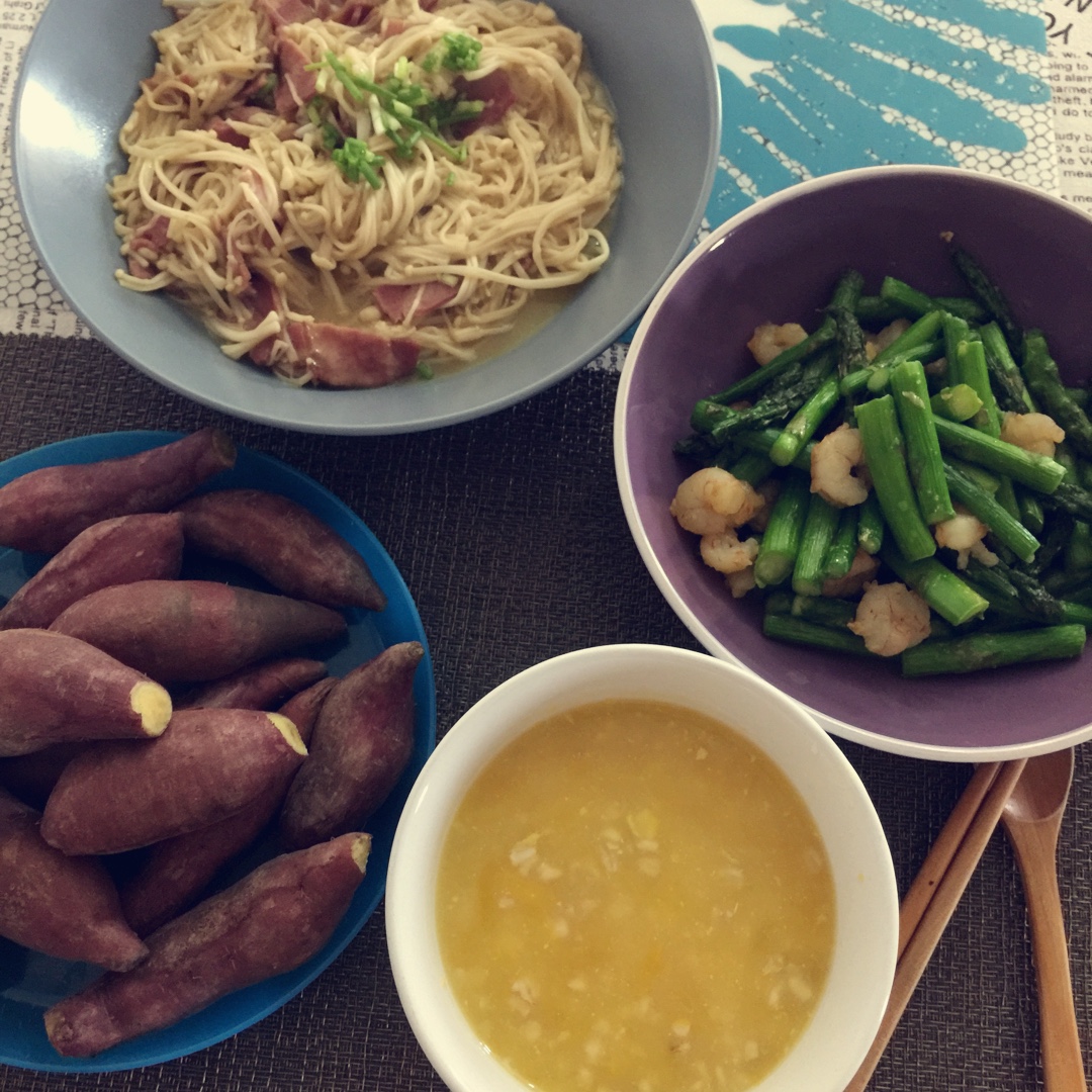 虾仁芦笋,培根金针菇,南瓜麦片粥,再来个紫薯吧,忙和了一上午,开饭