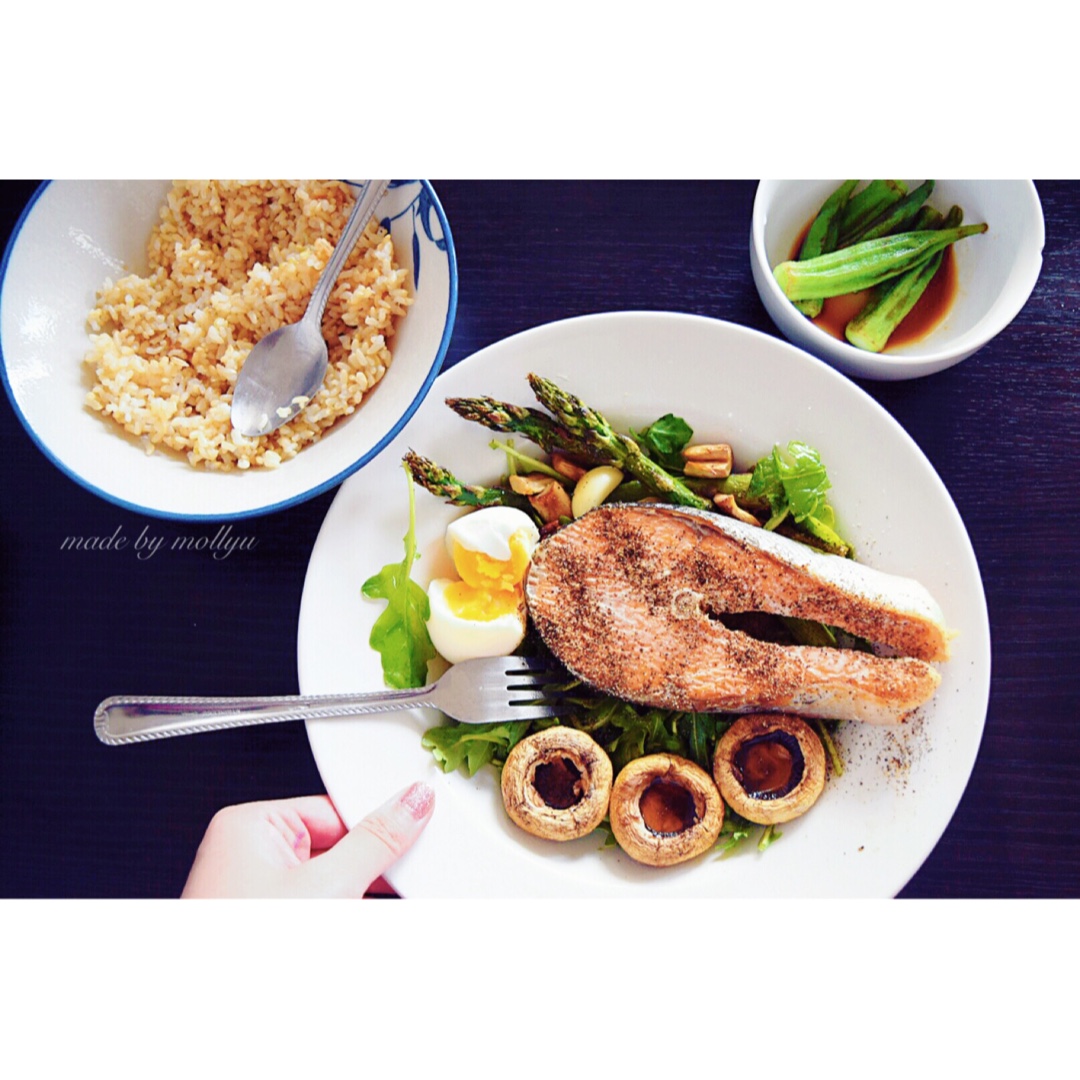 零波 做过 一盘食】一个人吃饭也要很华丽 妈哒!!!!刚刚码了好多好多字!全没了!!气得我!不码了!【烤三文鱼+烤芦笋+烤蘑菇+烤蒜+溏心蛋+油醋汁芝麻菜】+糙米饭一小碗+白灼秋葵】 #晚餐•2016年5月20日# 2016-05-20