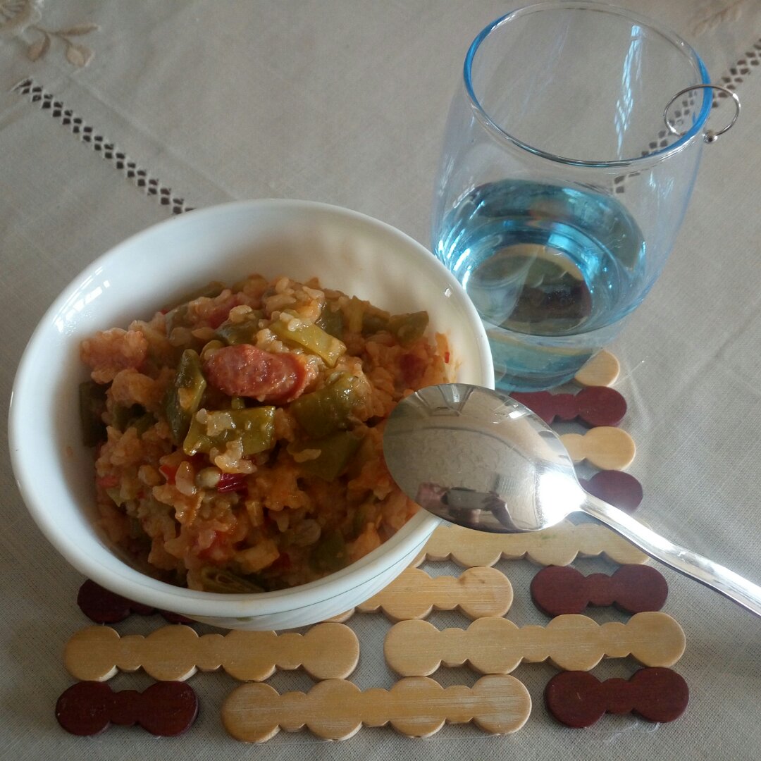香喷喷的番茄土豆豆角腊肉焖饭,配上一杯崂山蛇草水(哈哈哈难喝但是有预防癌症的功效),帅呆了~
