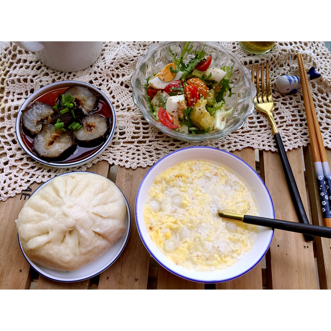 有桂花酒糟汤圆、蔬菜沙拉、葱油海参、梅干菜鲜肉大包的早晨......