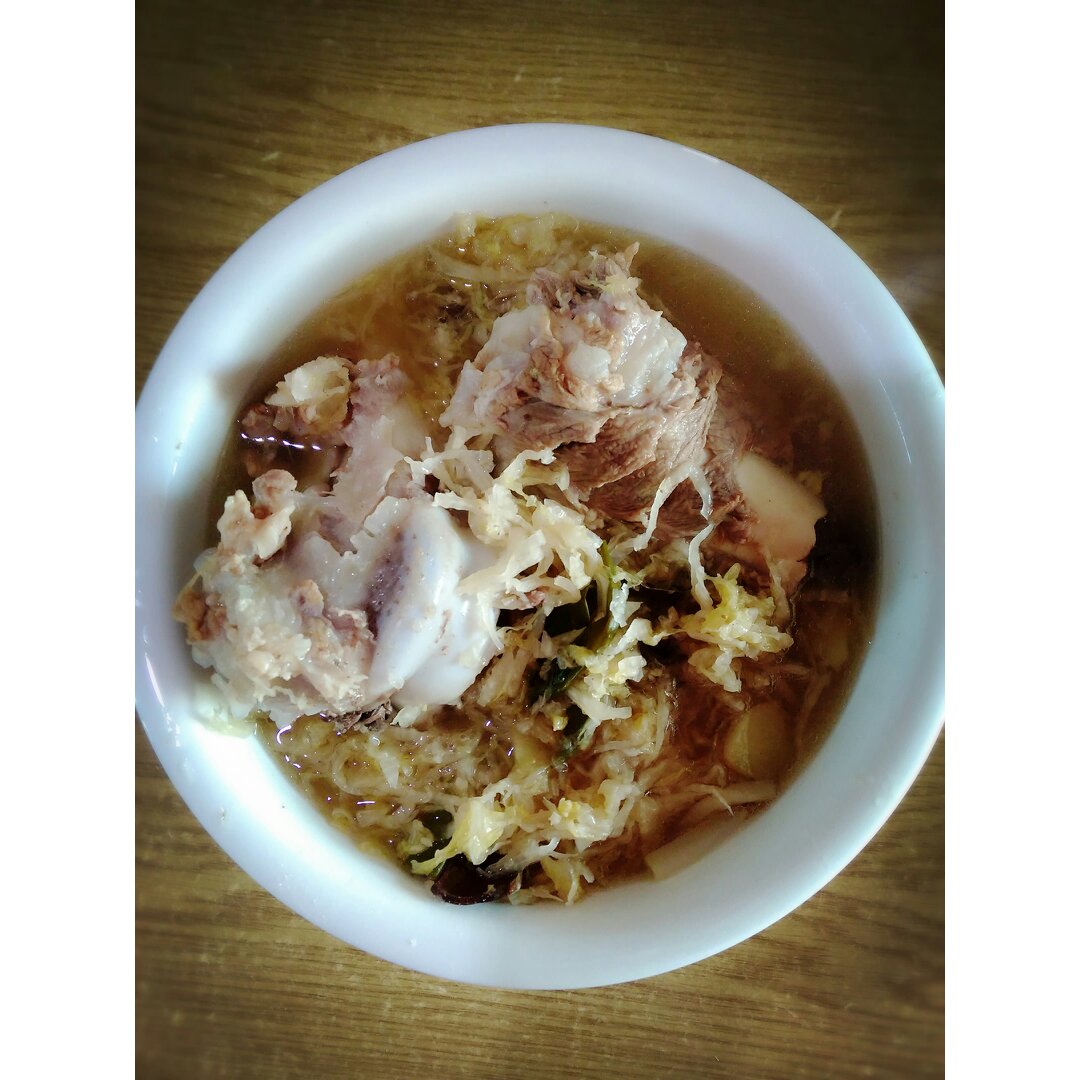 家里装修,好久没在家做饭了!现在完工了,做了大骨棒炖酸菜,味道超级好噢!