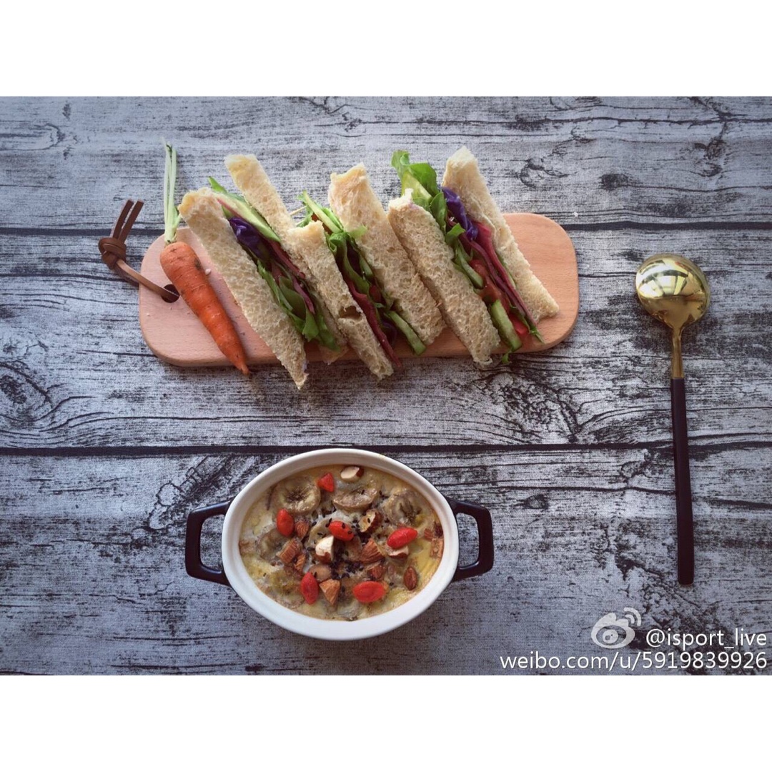 🌞🌞🌞牛肉火腿三明治+椰奶味儿的烤鸡蛋香蕉燕麦yummy