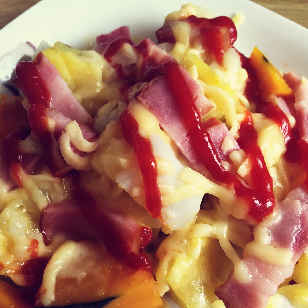 红薯,芋头和南瓜切丁后蒸的,再加芝士,培根和番茄酱微波一下就更好吃了。