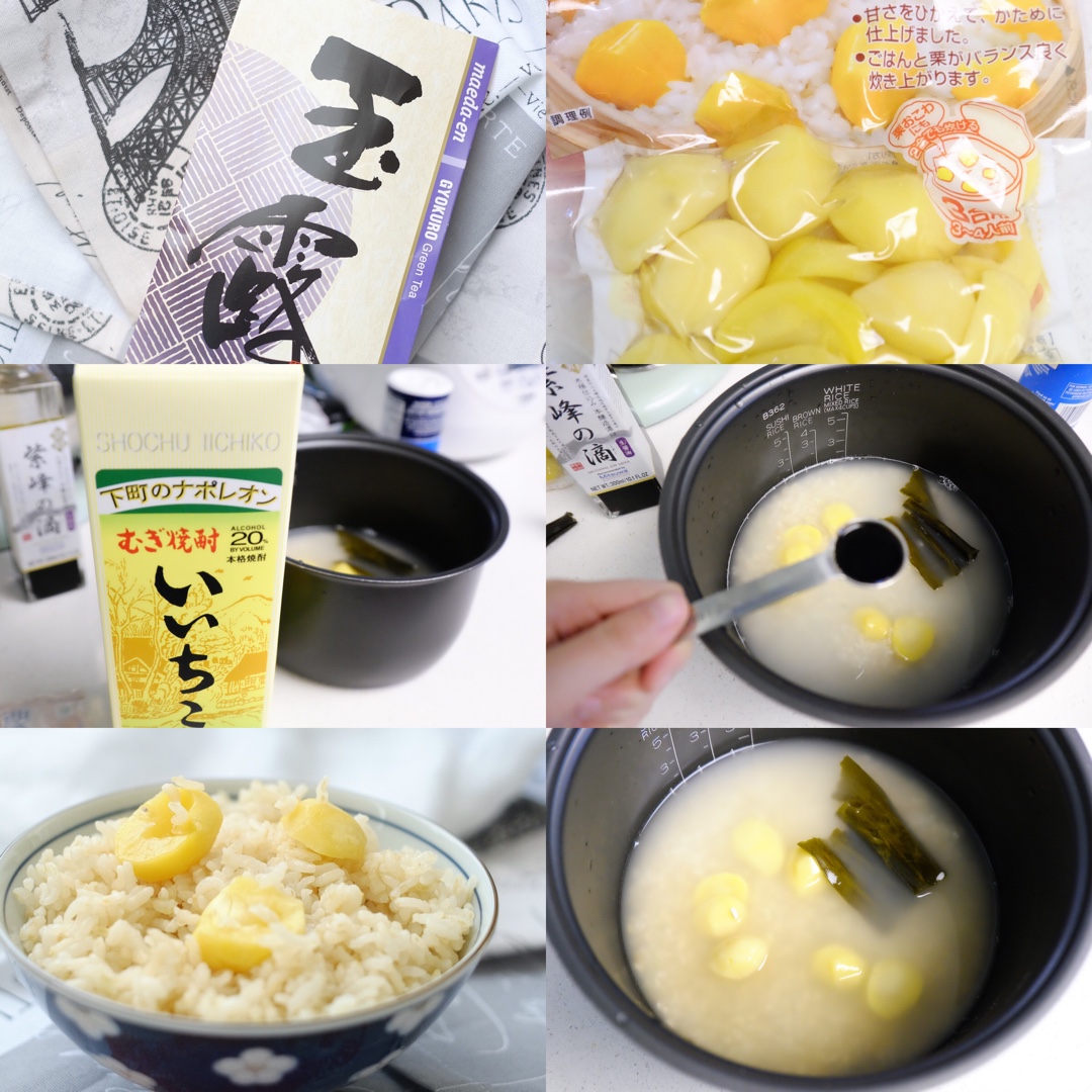 按照浓茶饭的做法,炊饭的时候加小段昆布,一大勺酒和一小勺酱油,放栗子,吃的时候淋热煎茶