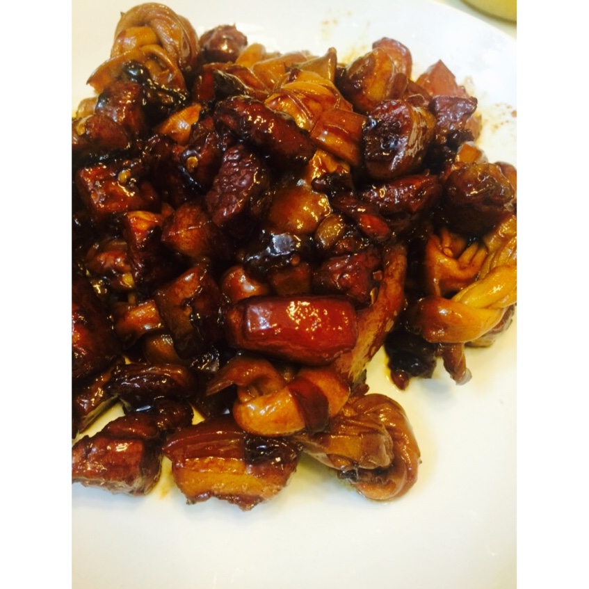 加了百叶结,貌似糖的烧色不是特别好!肉块切的比较小,一共烧了1个小时多一点,肉已经入口口感很绵软了!