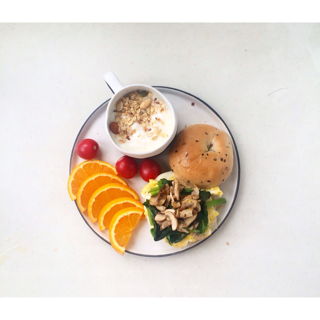 最后一个贝果!夹了蘑菇鸡蛋菠菜和cheese 等下粗去浪了~
