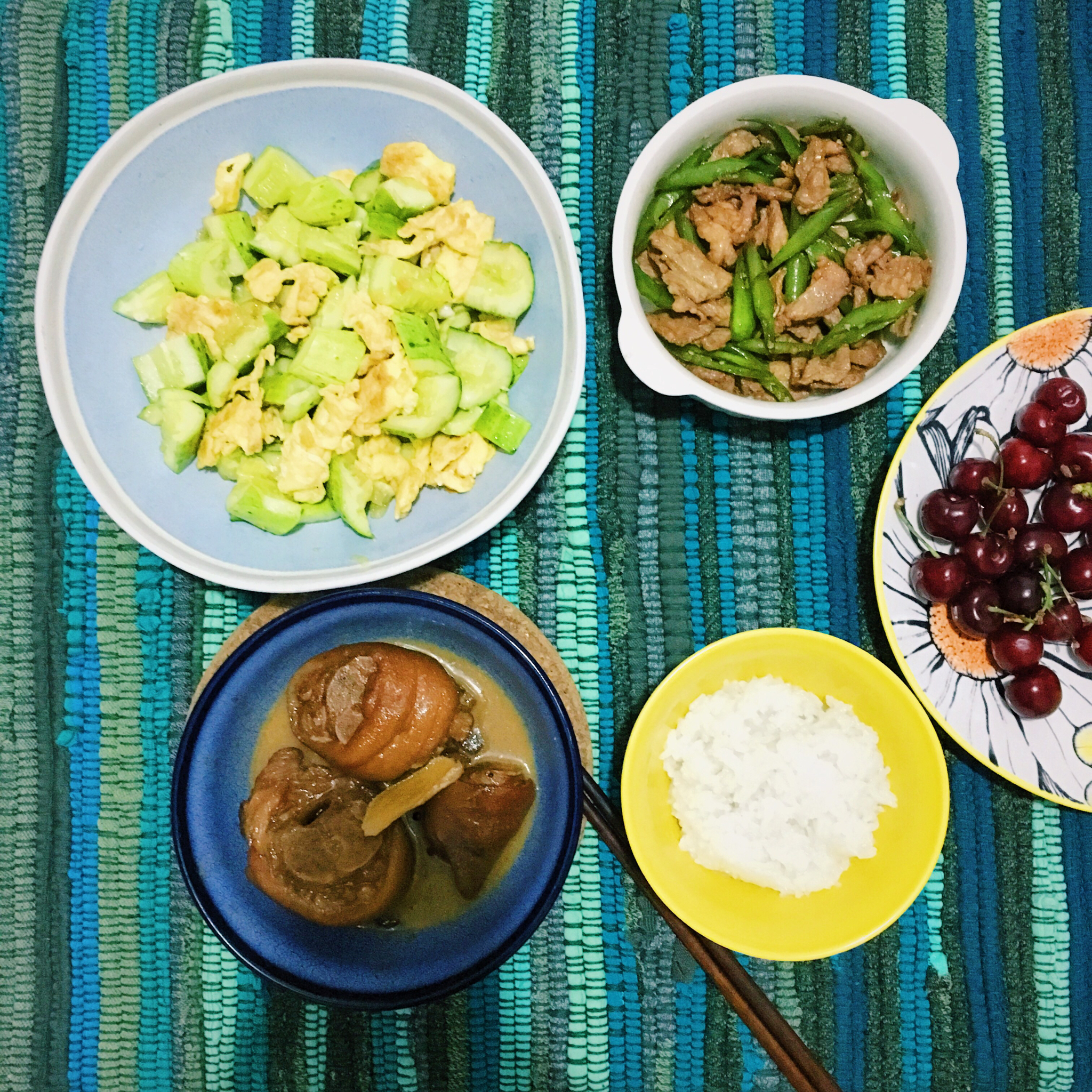 落阡薇陌 做过 晚餐•2016年6月13日 晚餐:还是猪蹄,辣椒炒肉,黄瓜凉拌鸡蛋,米饭。这么晚才吃完,长肉不能停,以后要早点吃,即使加班君还没回来。 #晚餐•2016年6月13日# 2016-06-13