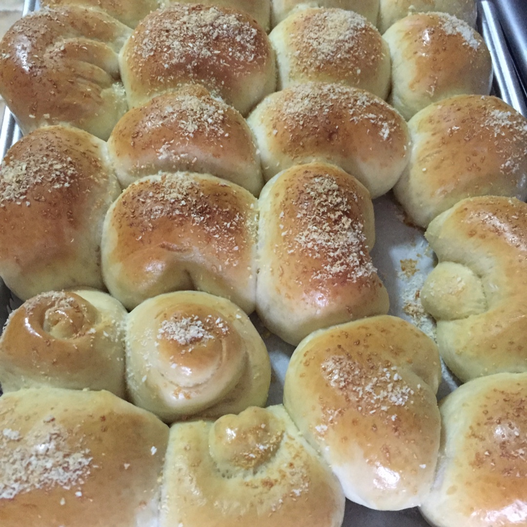 形状没有弄好,不过味道好极了。我的烤箱温度低,烤了30分钟,刚刚好,这次的面包皮也软软的