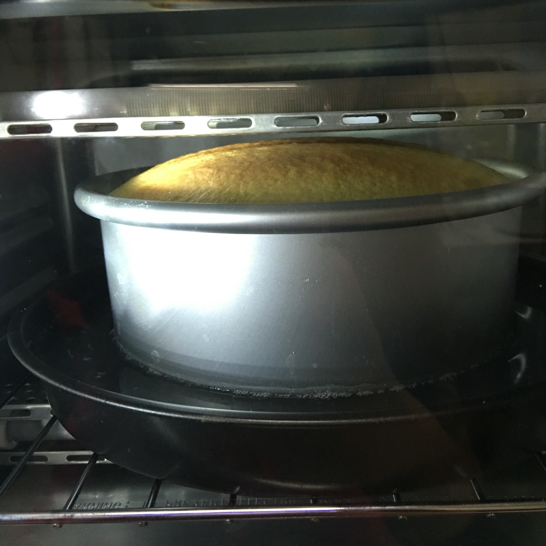 烤了45分钟,蛋糕膨胀到顶着烤灯,然后就赶紧拿出来了,也能吃,没有同事做的那么软,微腻。