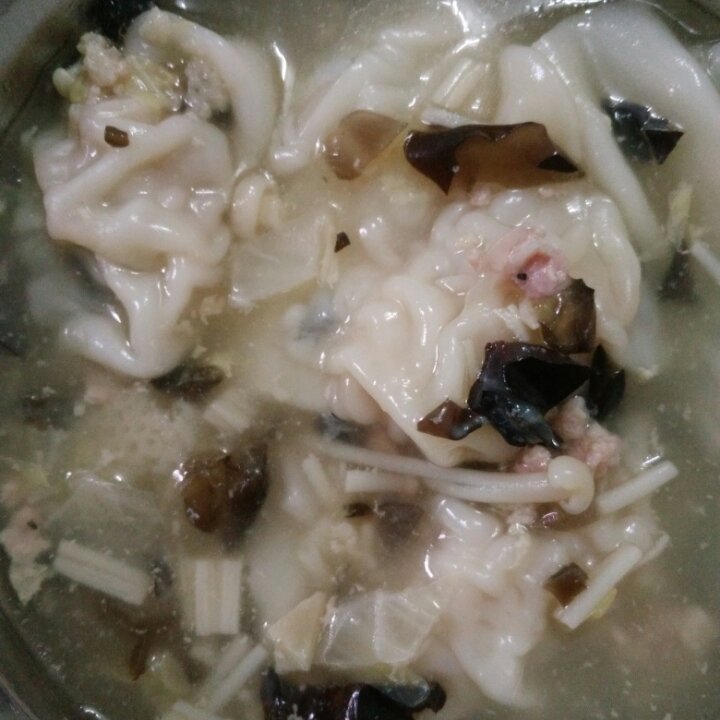 白菜木耳金针菇云吞,馅太多了,就把剩下的拿来煮了汤,还可以~
