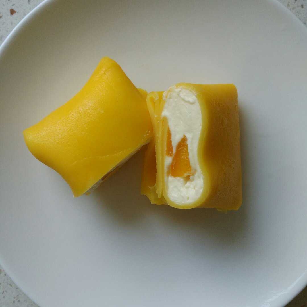 18的不沾锅做了五张皮,有点厚。第一次包,怕漏没敢放很多奶油。
