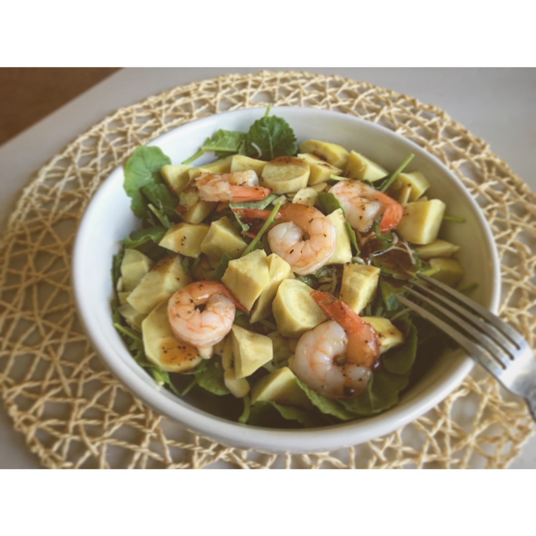 Meredith咩乐滴斯 做过 少吃红肉多吃草 有利环境身体好~ 大热天的来个清爽的沙拉吧~有紫薯,小羽衣甘蓝,mozzarella芝士,杏仁片,虾仁~ #晚餐•2016年7月31日# 2016-08-01