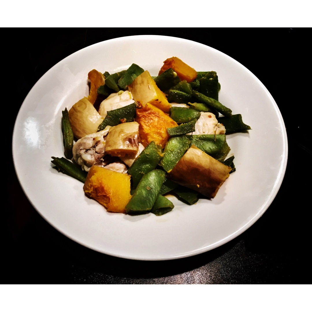好吃不过家常菜!下面是高压锅煮的水煮鸡腿... 因为比较快... 南瓜豆角炖好了浇上去就有味道了。