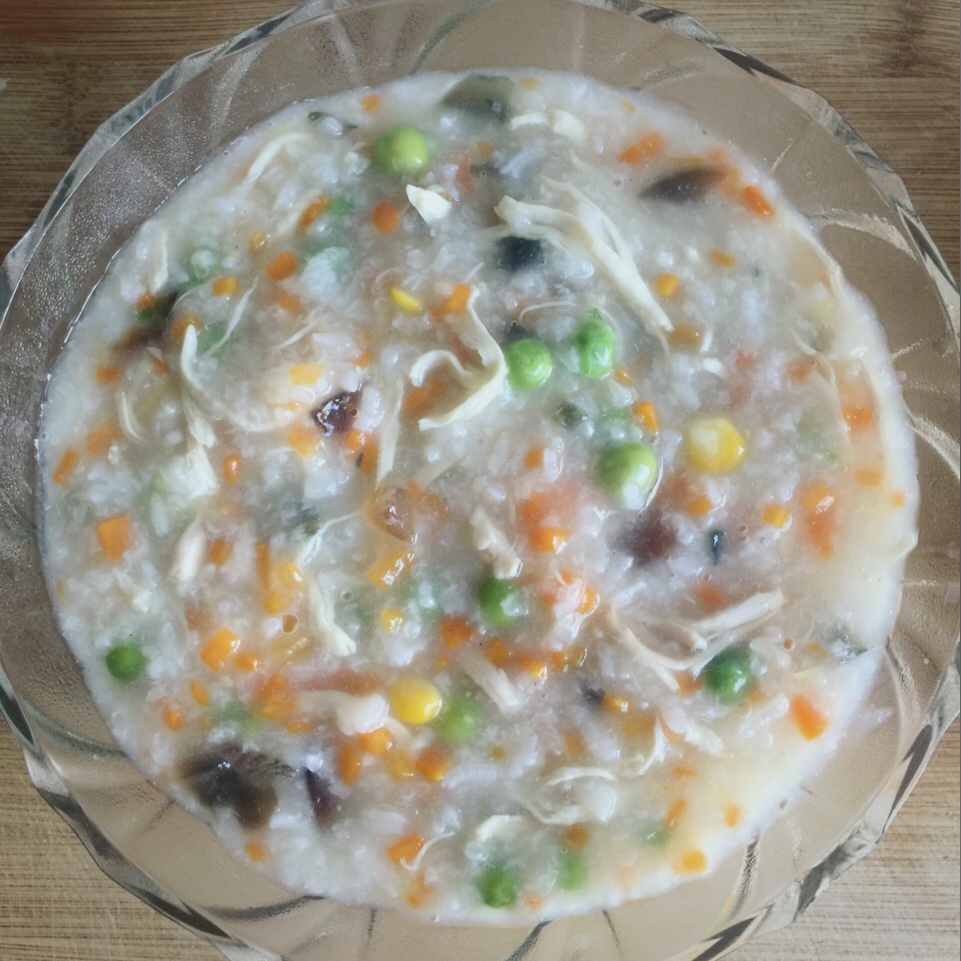吃午饭啦~ 营养丰富的什锦鸡丝皮蛋粥 加了玉米颜色完美了