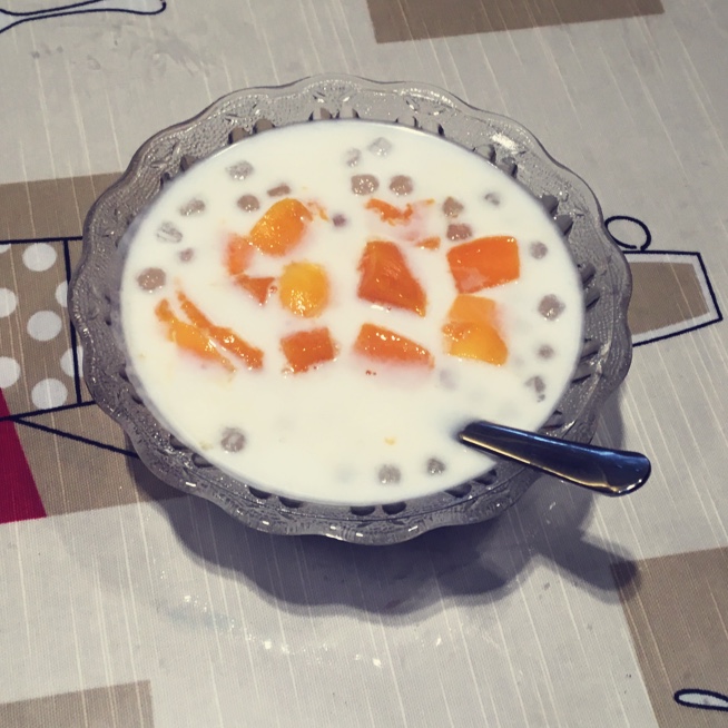 别人送的椰子粉,兑上鲜牛奶味道一个棒,为此特意大热天窝厨房里熬了一瓶西米,配上小台芒,清新爽口呀!