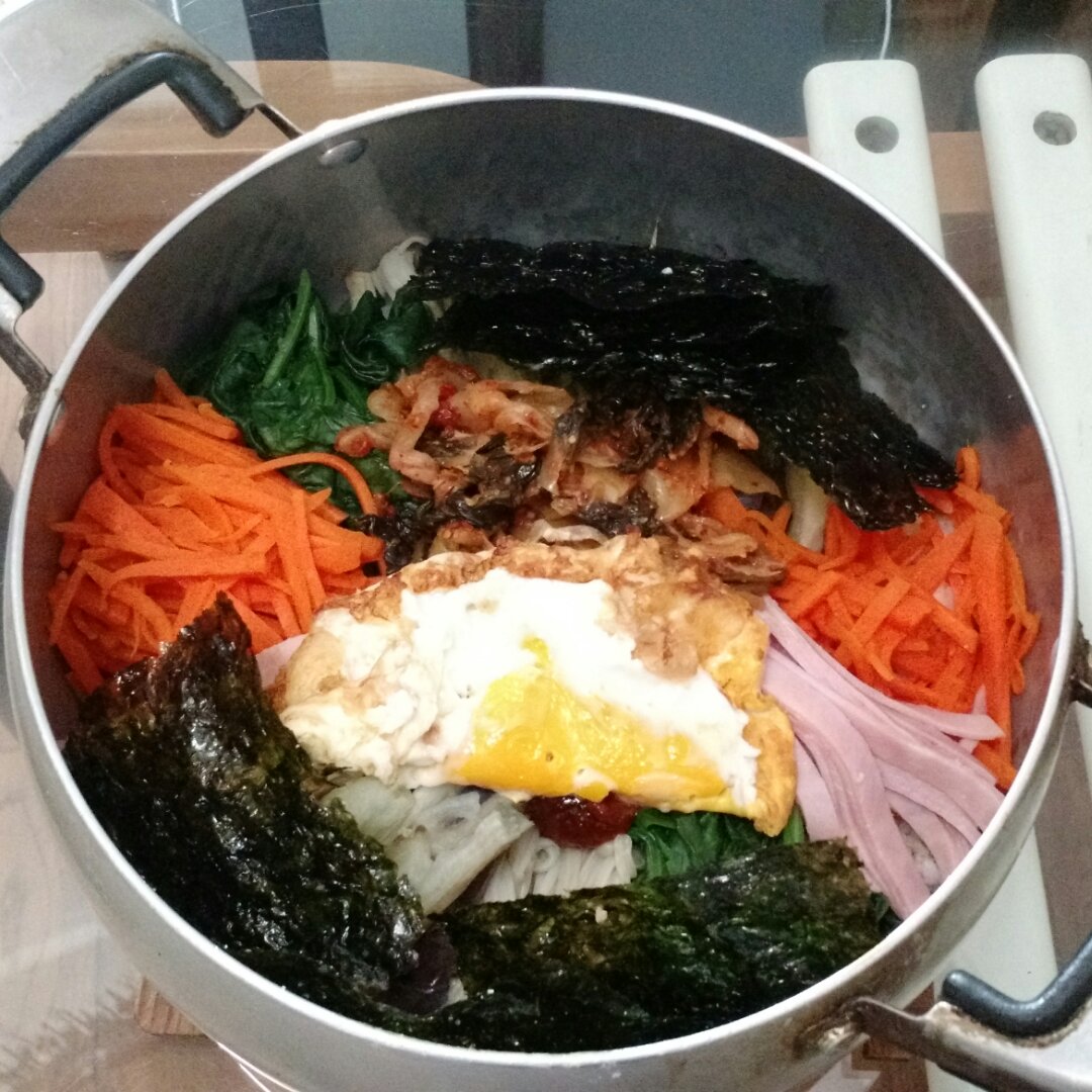 总觉得只放辣椒酱不够味道,这次学着韩剧里加了韩式包肉酱和千岛酱,又放了些海苔,香到起飞!
