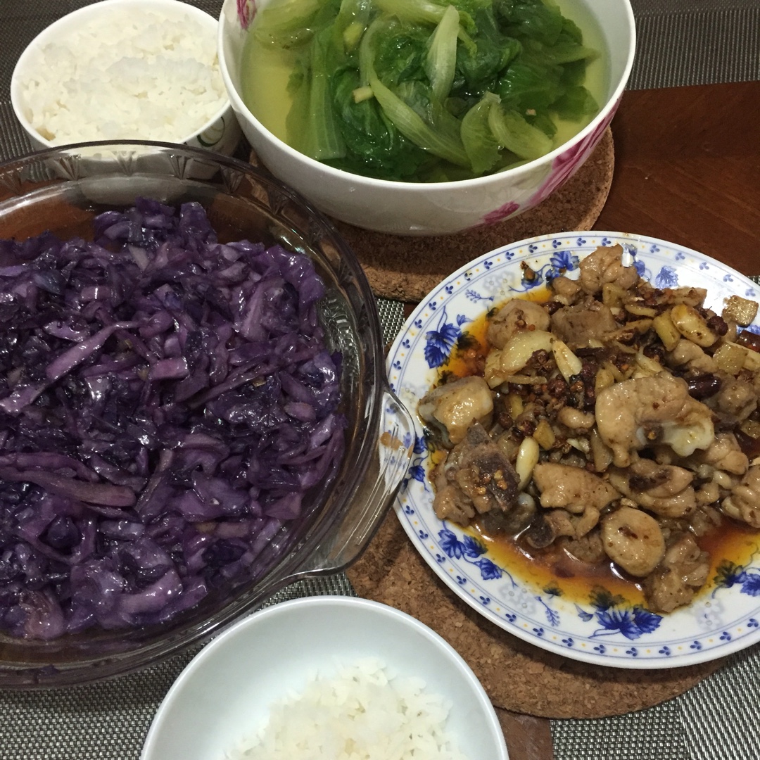 生菜汤,炒紫甘蓝,炒鸡腿肉