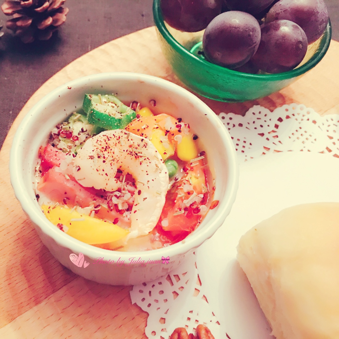 JuliaJuanJuan 做过 我的早餐我做主~五彩斑斓 否极泰来,又到了最爱的周五❤🌹#我的早餐我做主~五彩斑斓#ココットカマン〜(カマンベール卡门贝尔乳酪焗虾仁培根蔬菜)蜂蜜小排包配椰油和自制樱桃果酱~抹茶拿铁~坚果…~巨峰葡萄🍇~ #早餐•2016年8月19日##记录生活点滴##我的早餐我做主##美好的一天从早餐开始# 2016-08-19