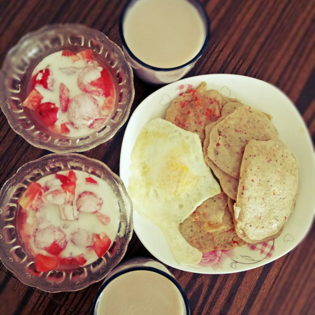 特意早起给家人做的早餐……胡萝卜鸡蛋饼,五谷豆浆,酸奶西红柿西瓜沙拉😍😍