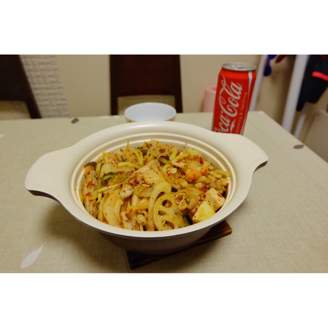 晚上就做了一大锅鸡公煲,鸡翅藕片西芹花菜杏鲍菇,齐全了。