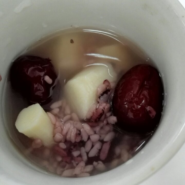 今天是处暑,据说吃点山药是极好的。做的这款甜品是红枣山药紫米酒酿饮。