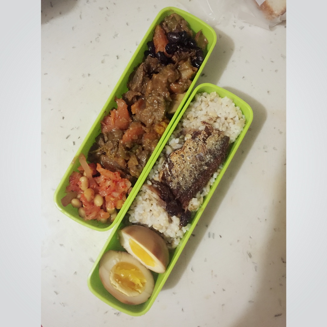 杂粮饭,豆豉鲮鱼,日式溏心蛋,咖喱牛肉,豆子和萝卜的韩式泡菜。