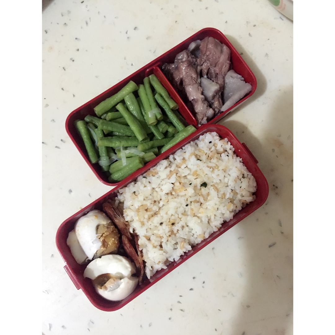 鸡汤里捞起来的腿和山药(汤里有红豆所以颜色深),鸡汤烩过的豆角,咸蛋,香肠和燕麦大米饭。)