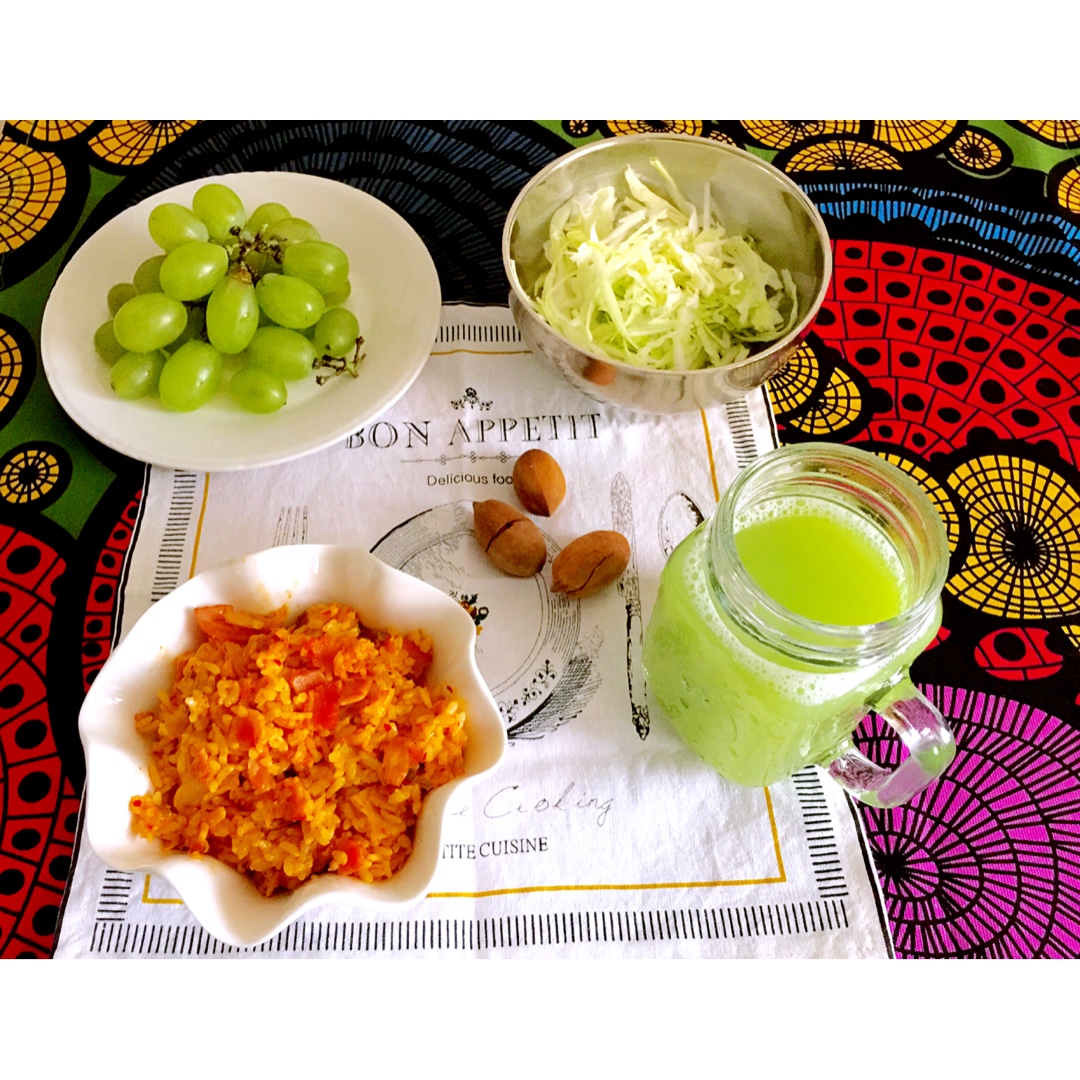 我和早餐有个约会(第34天,辣白菜培根炒饭,拌圆白菜丝,青提,苦瓜雪梨汁,坚果)
