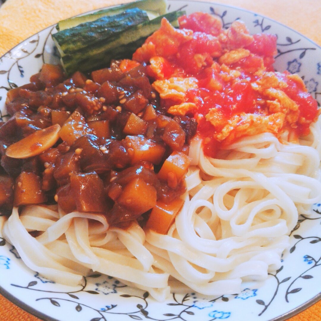 双拼盖浇面,茄子卤、西红柿卤,不错不错