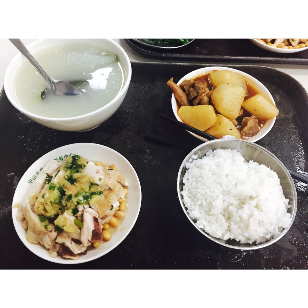 中大食堂,典型的广东菜系,萝卜牛腩、白斩鸡、冬瓜排骨汤,很好吃,比重大食堂好得多,食堂肯定也比外面吃便宜、干净。