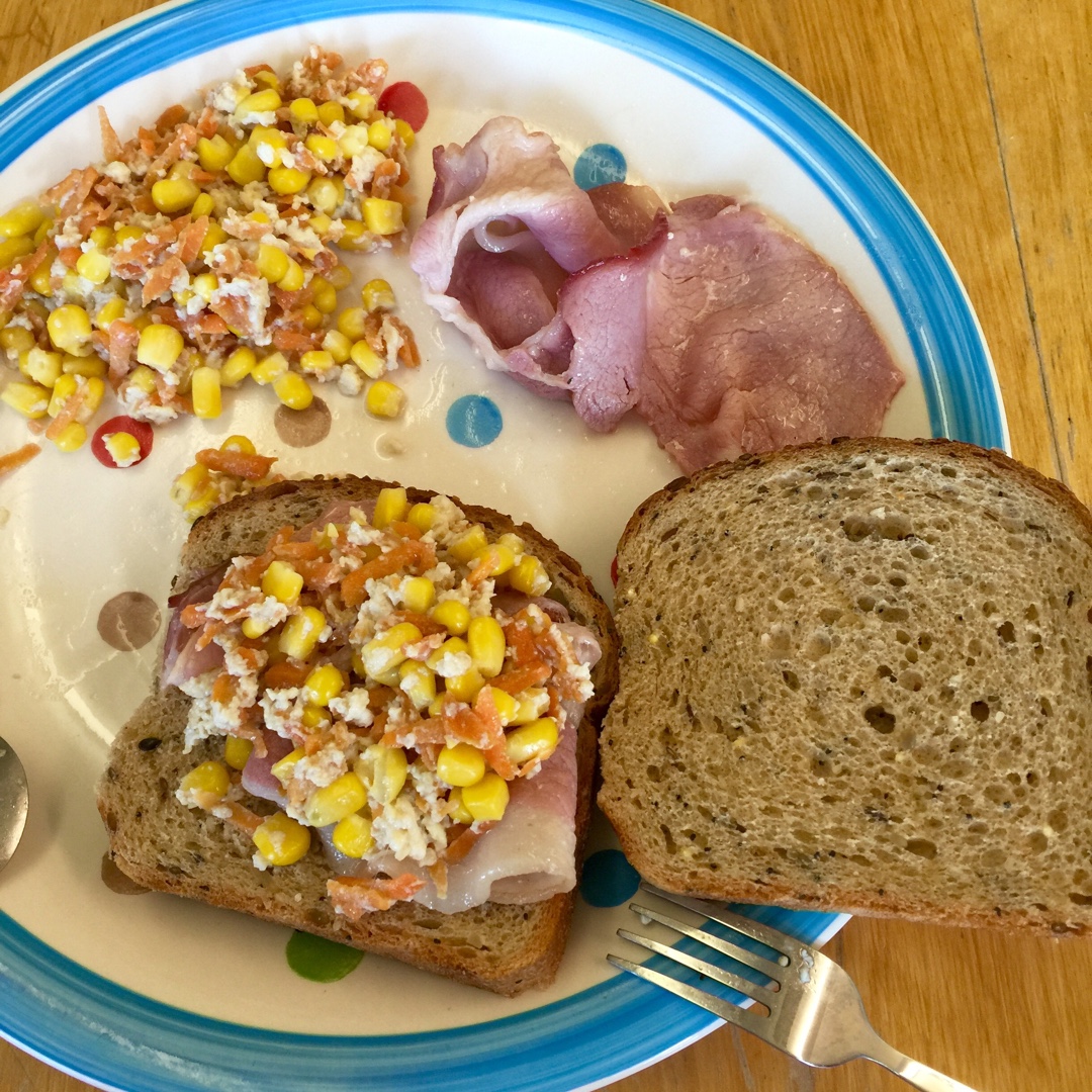 玉米粒胡萝卜炒蛋 培根 吐司
