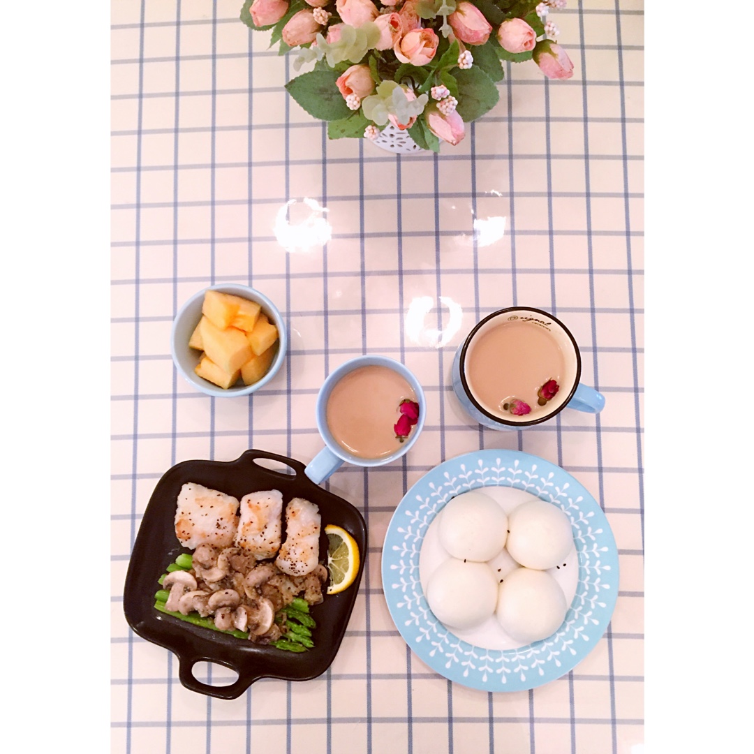 柠檬煎龙利鱼,蒜香蘑菇和芦笋,奶黄包,奶茶,哈密瓜。