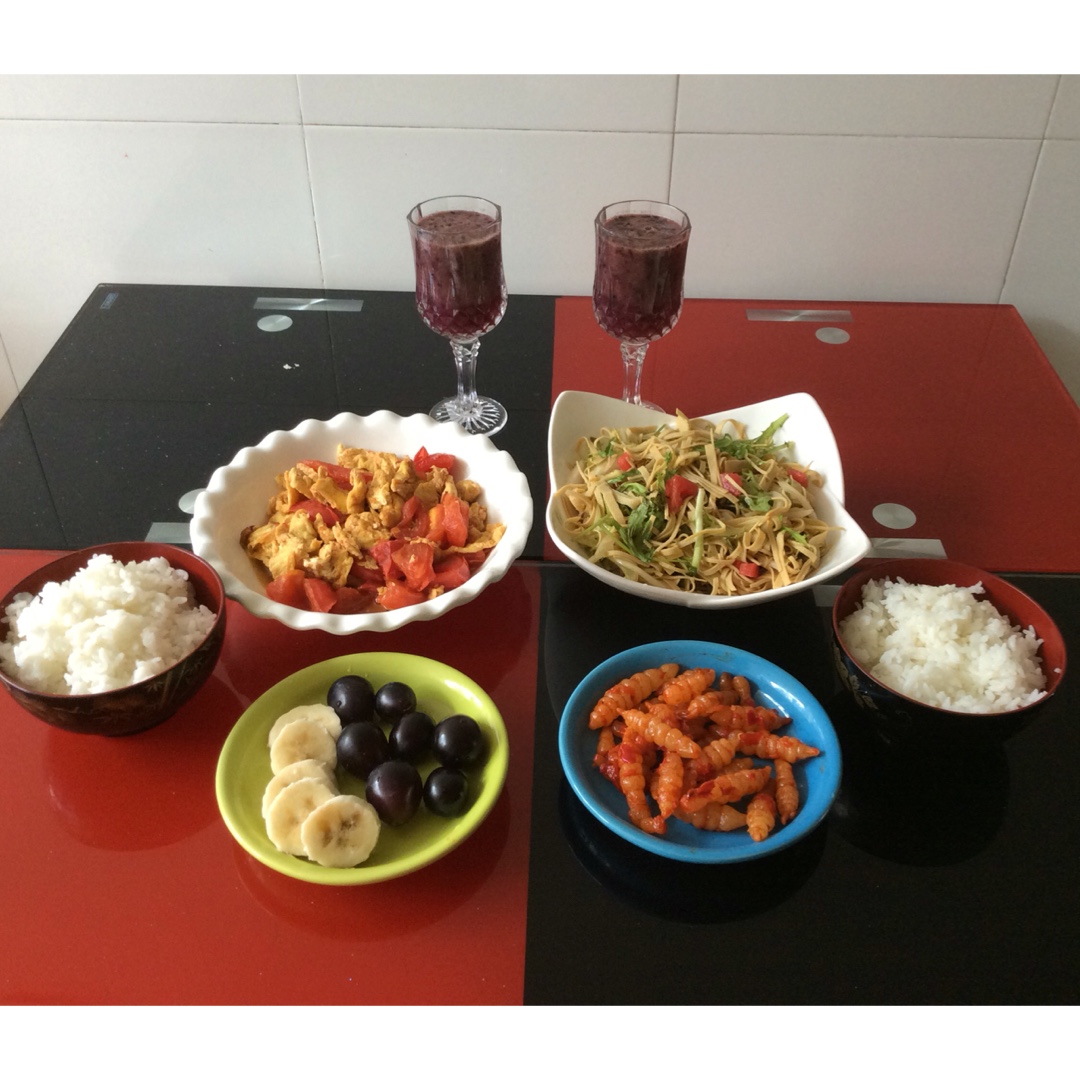 柿子炒鸡蛋 炝干豆腐丝 白米饭 鲜榨葡萄汁 水果