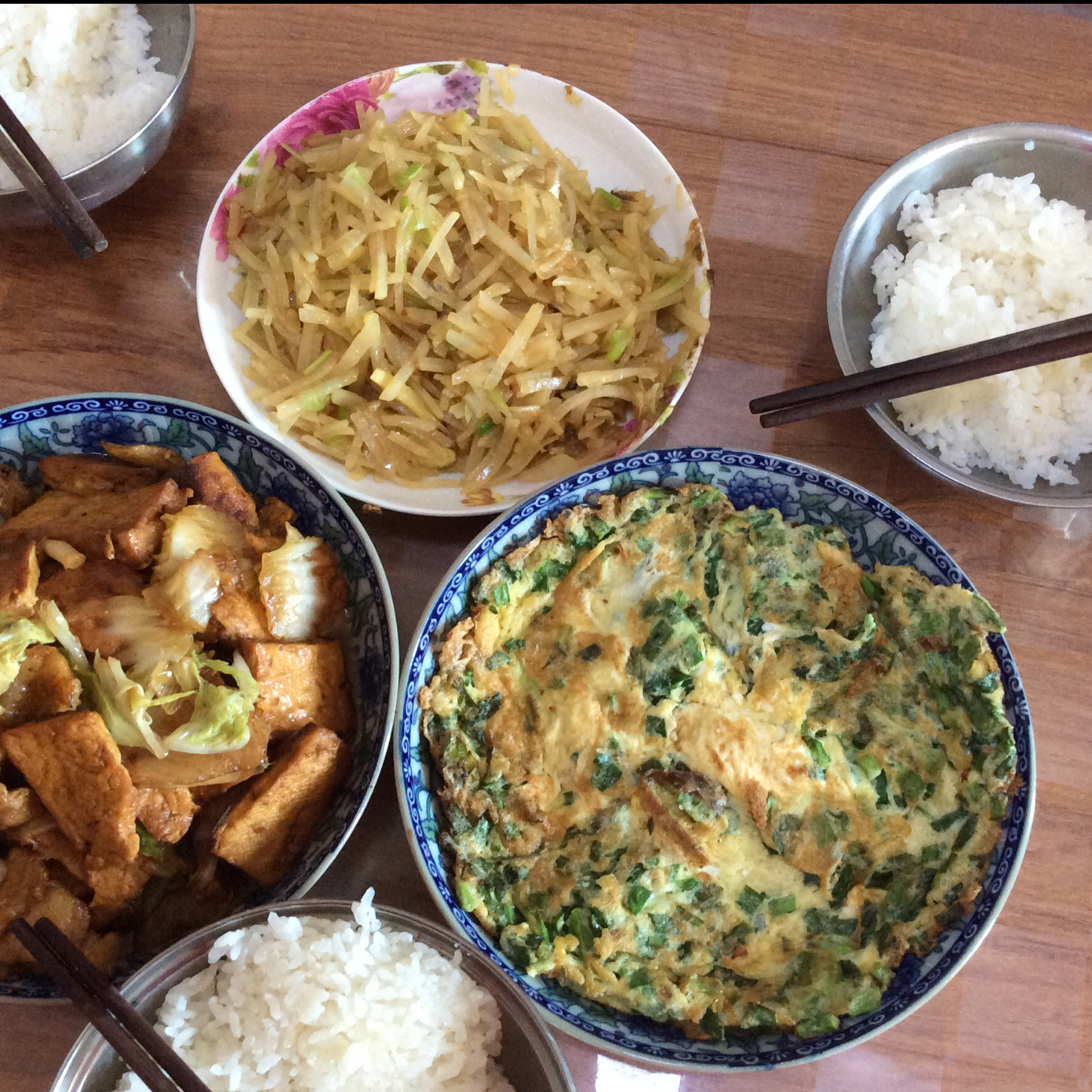豆腐炒白菜,干炒土豆丝,韭菜鸡蛋