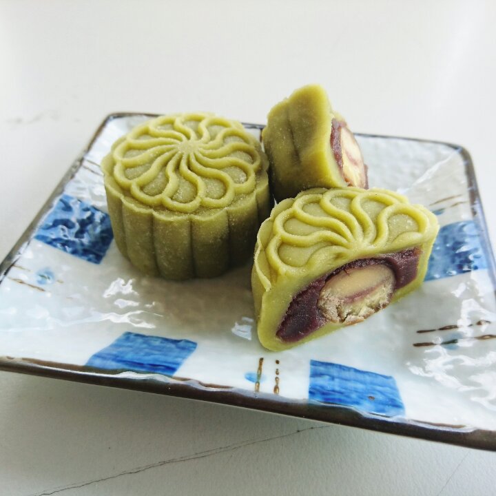 皮加了抹茶粉,馅里放了糖栗子,抹茶红豆栗子的搭配棒呆~