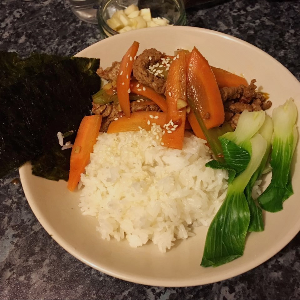 胡萝卜芹菜牛肉,烫青菜,海苔。周师傅越来越能耐了