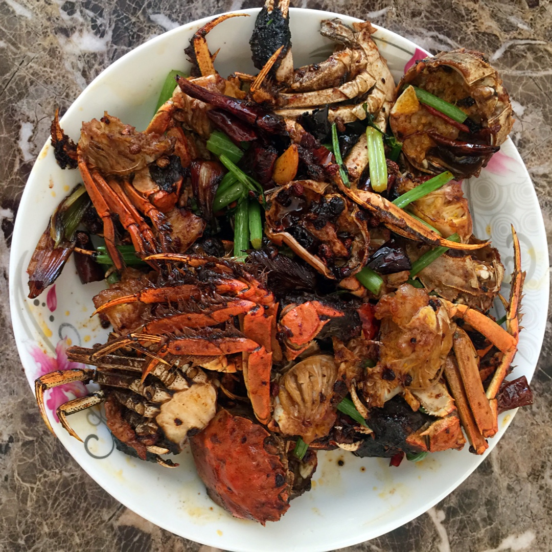 【午餐:干煸鱿鱼须➕香辣蟹➕咸菜炖小雨➕米饭】