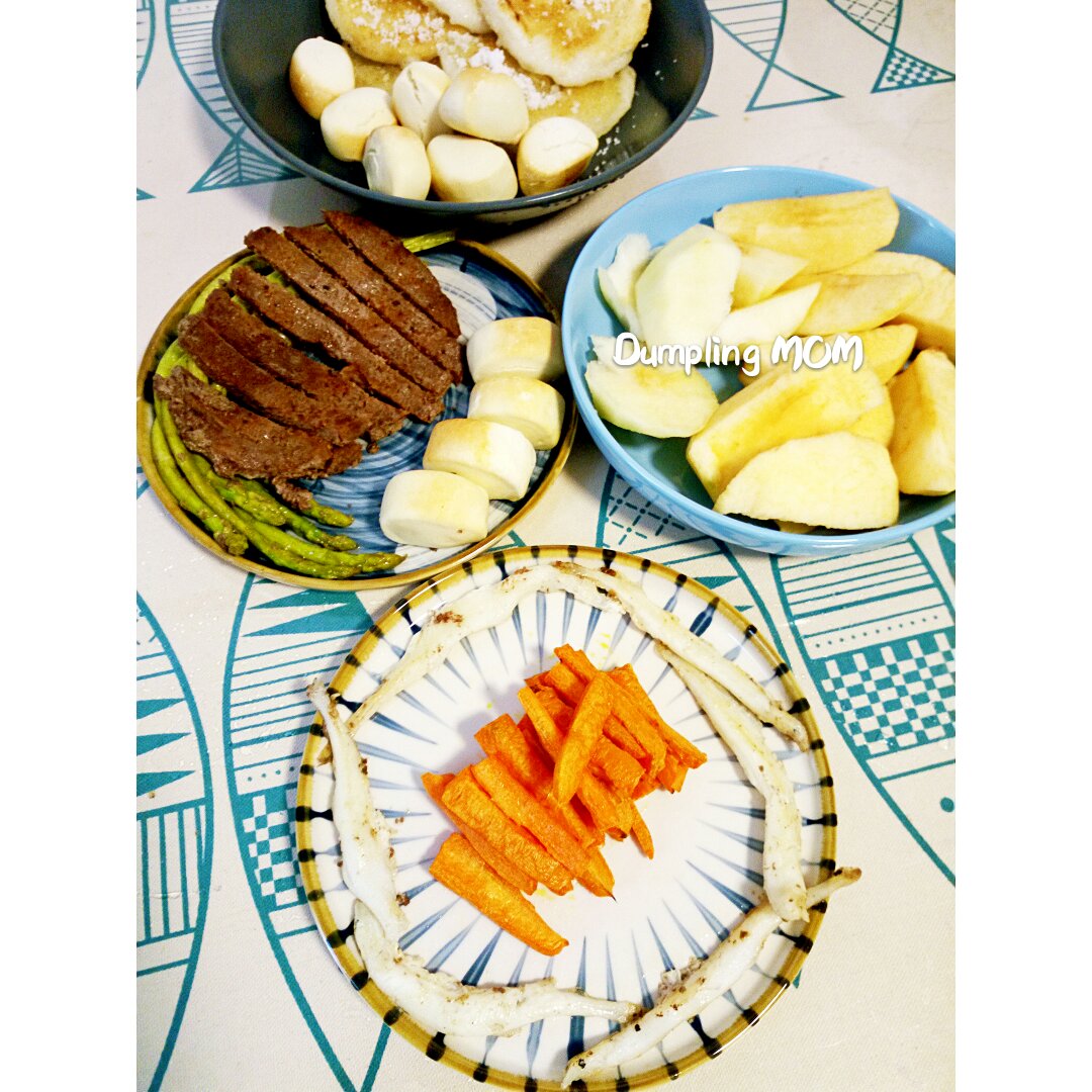烤馍烤胡萝卜+煎小银鱼牛排