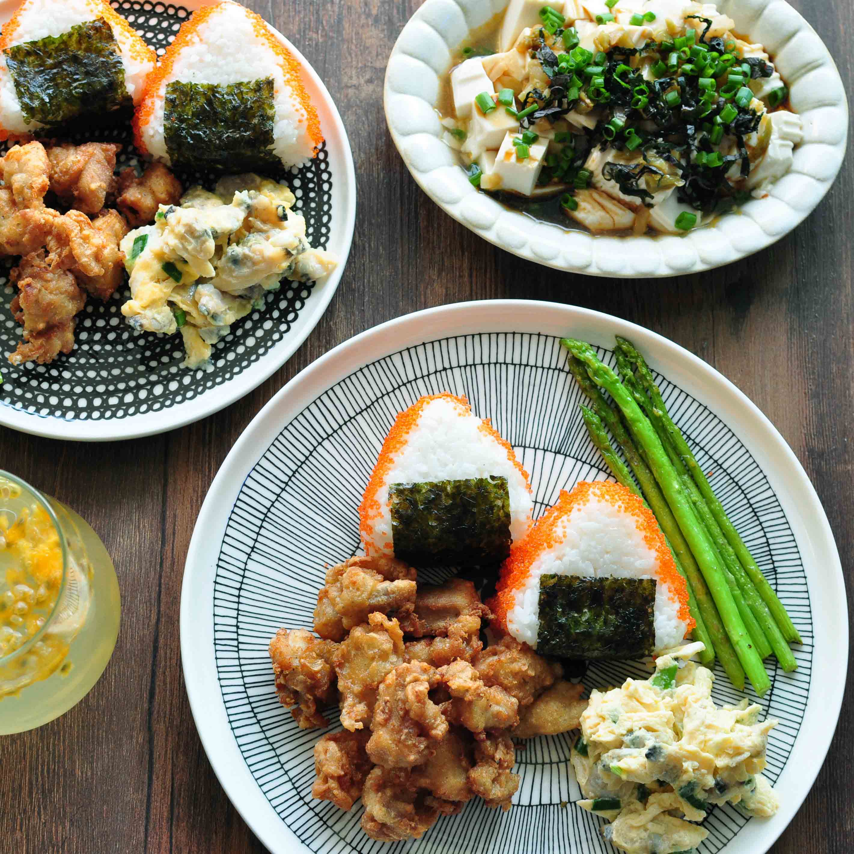 still_blooming 做过 晚餐•2016年9月19日 几天没在家吃饭了 做点自己喜欢吃的 中午留多些饭 做了几个蟹籽饭团 拿2只鸡腿出来做炸鸡 超市特价的冷冻小蚬子 用鸡蛋和葱花炒出来 绢豆腐做凉菜 加点榨菜粒和紫苏丝 冰箱里剩的芦笋 盐和胡椒简单煎一下 OK晚餐搞定啦 #晚餐•2016年9月19日# 2016-09-19