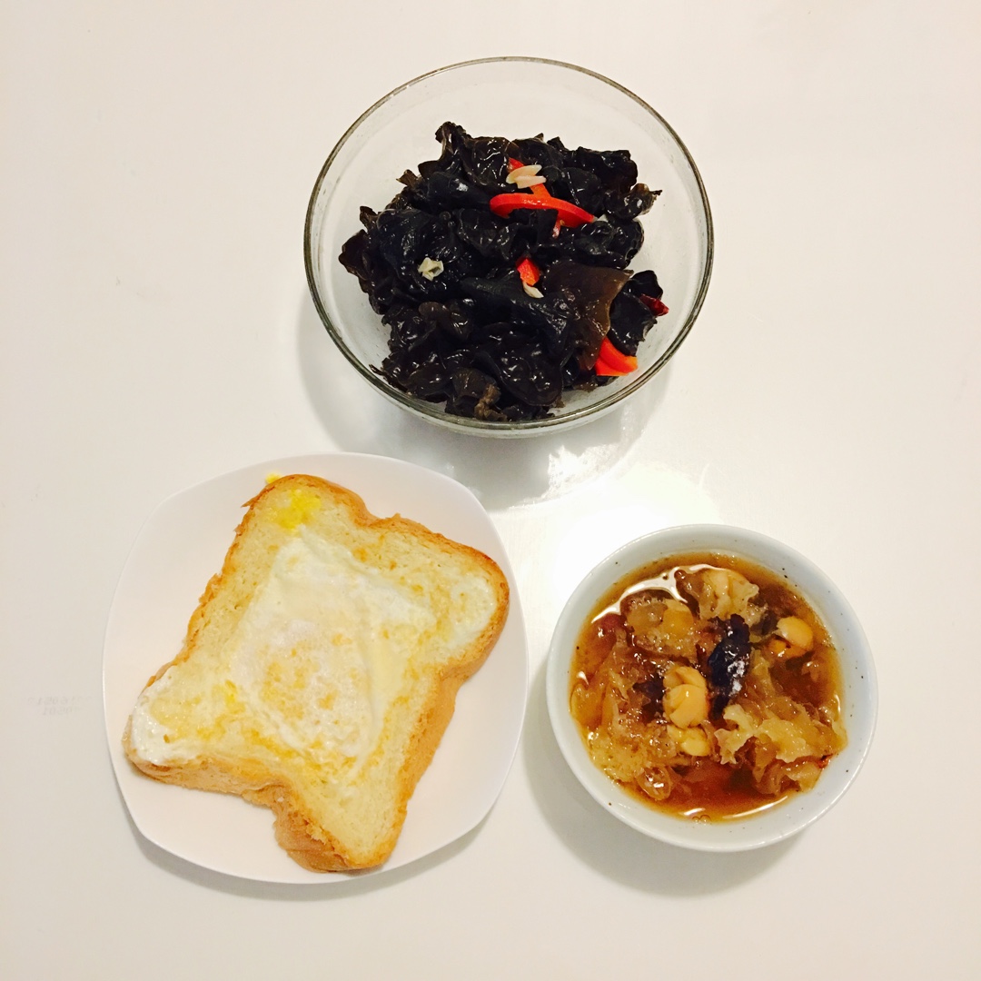 拌木耳,鸡蛋吐司,桃胶皂角米银耳羹