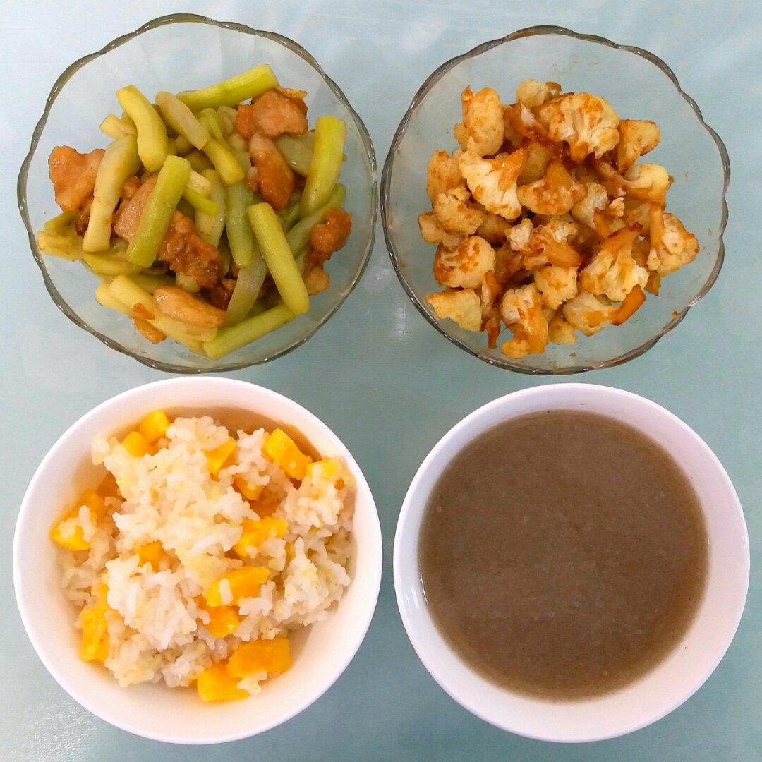 肉炒茄条,干煸菜花,四米饭(发芽米+大米+糯米+小米),香菇山药汤