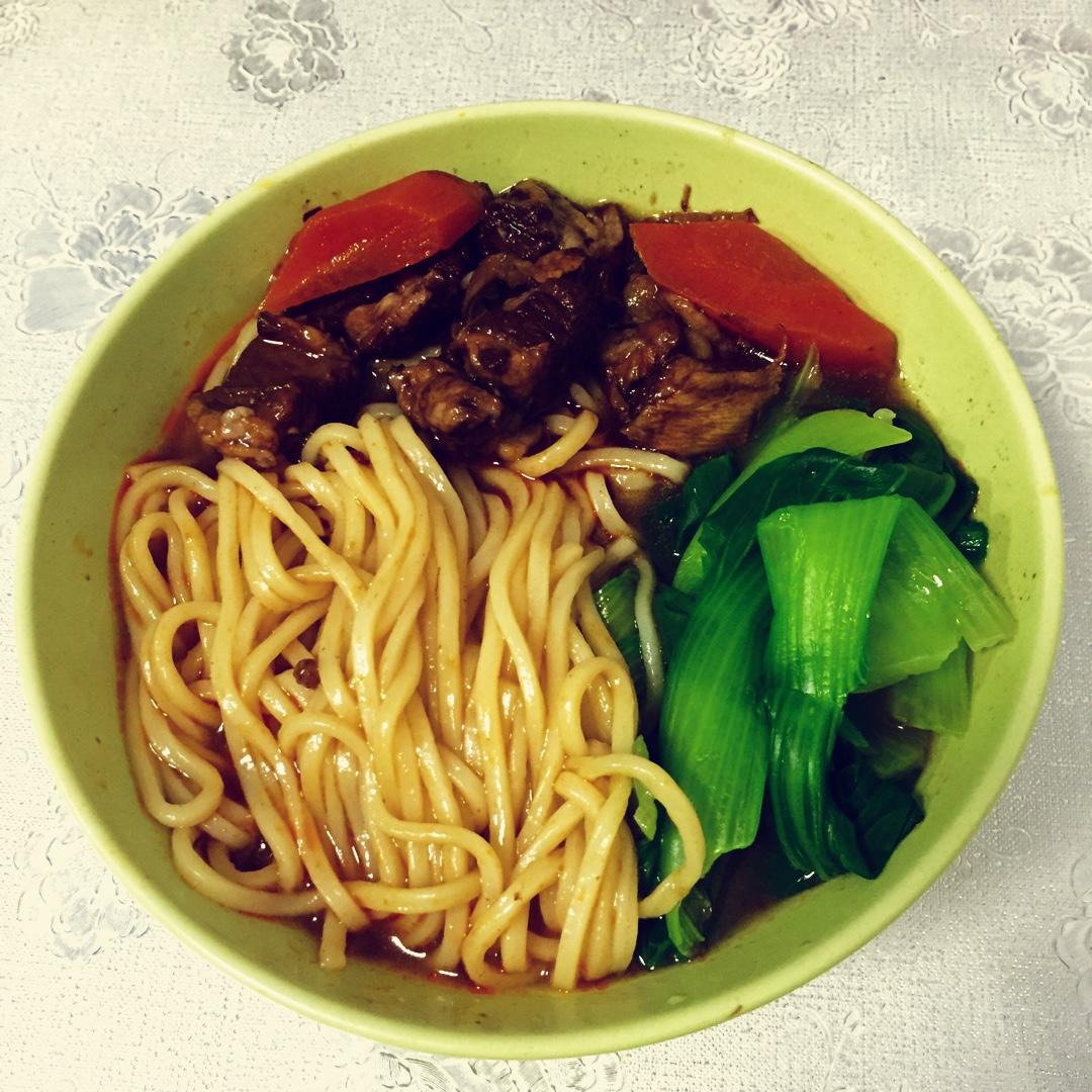 中午炖的牛肉,晚上红烧牛肉面。加了点辣,在下雨的晚上,很满足。